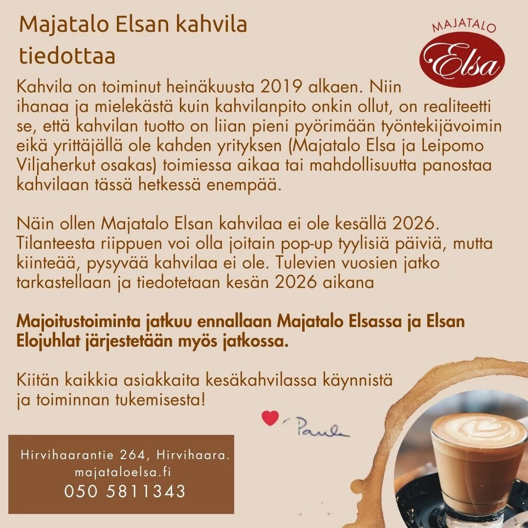 Majatalo Elsan kesäkahvila on suljettu elokuussa 2025. Kesälle 2026 kesäkahvila ei ainakaan entisessä mallissa avaudu, joitain popup tyyppisiä aukioloja saattaa tulla - näistä ilmoitellaan.